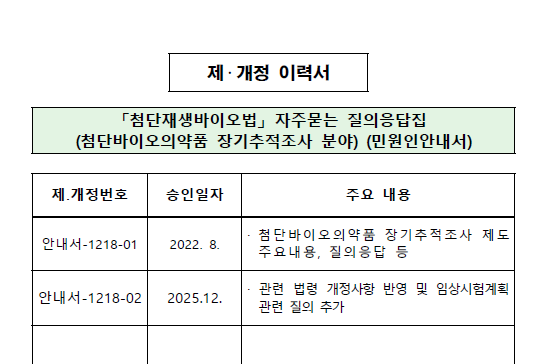 「첨단재생바이오법」자주묻는 질의응답집(첨단바이오의약품 장기추적조사 분야)(민원인안내서) 자료는 '2025년 12월 23일' 자로 식품의약품안전처의 홈페이지에 게시 되었습니다.