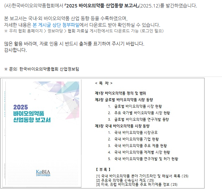 「2025 바이오의약품 산업동향 보고서」 (2025.12) 발간 안내 자료는 '2025년 12월 29일' 자로 한국바이오의약품협회의 홈페이지에 게시 되었습니다.